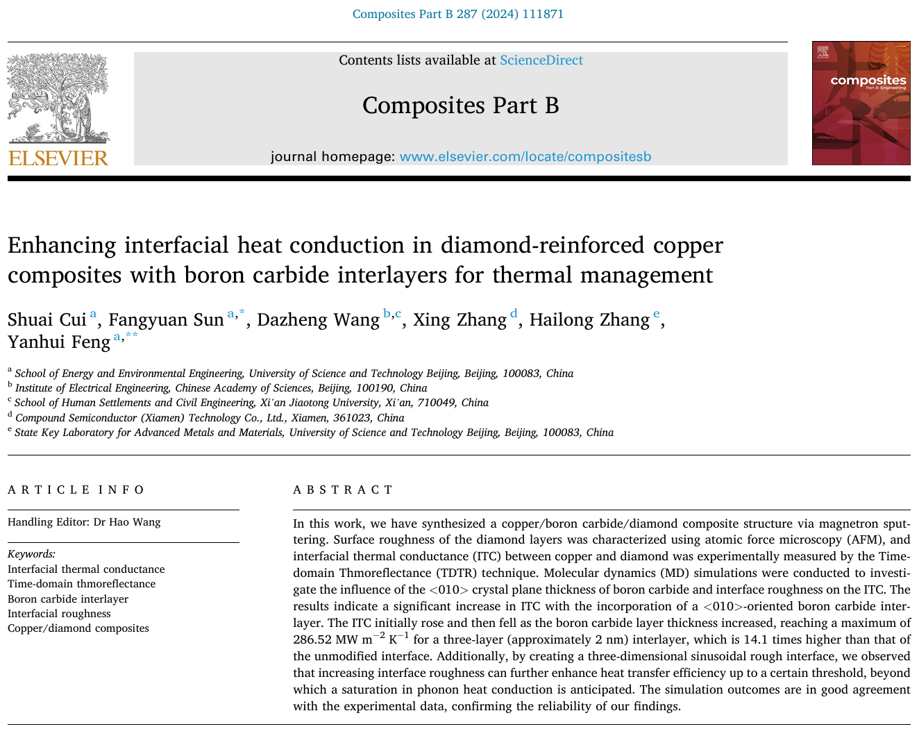 随着信息技术的飞速发展,电子设备正变得越来越小型化、集成化。然而,这种进步也带来了一个严峻的问题——设备过热。热量的有效管理成为了电子设备性能和寿命的关键因素。在此背景下,北京科技大学能源与环境工程学院孙方远副教授研究团队在《Composites Part B》上发表了一项突破性研究,通过在铜/金刚石复合材料中引入碳化硼(B4C)中间层和优化界面粗糙度,显著提升了材料的界面热导性,为电子设备的热管理提供了新的解决方案。