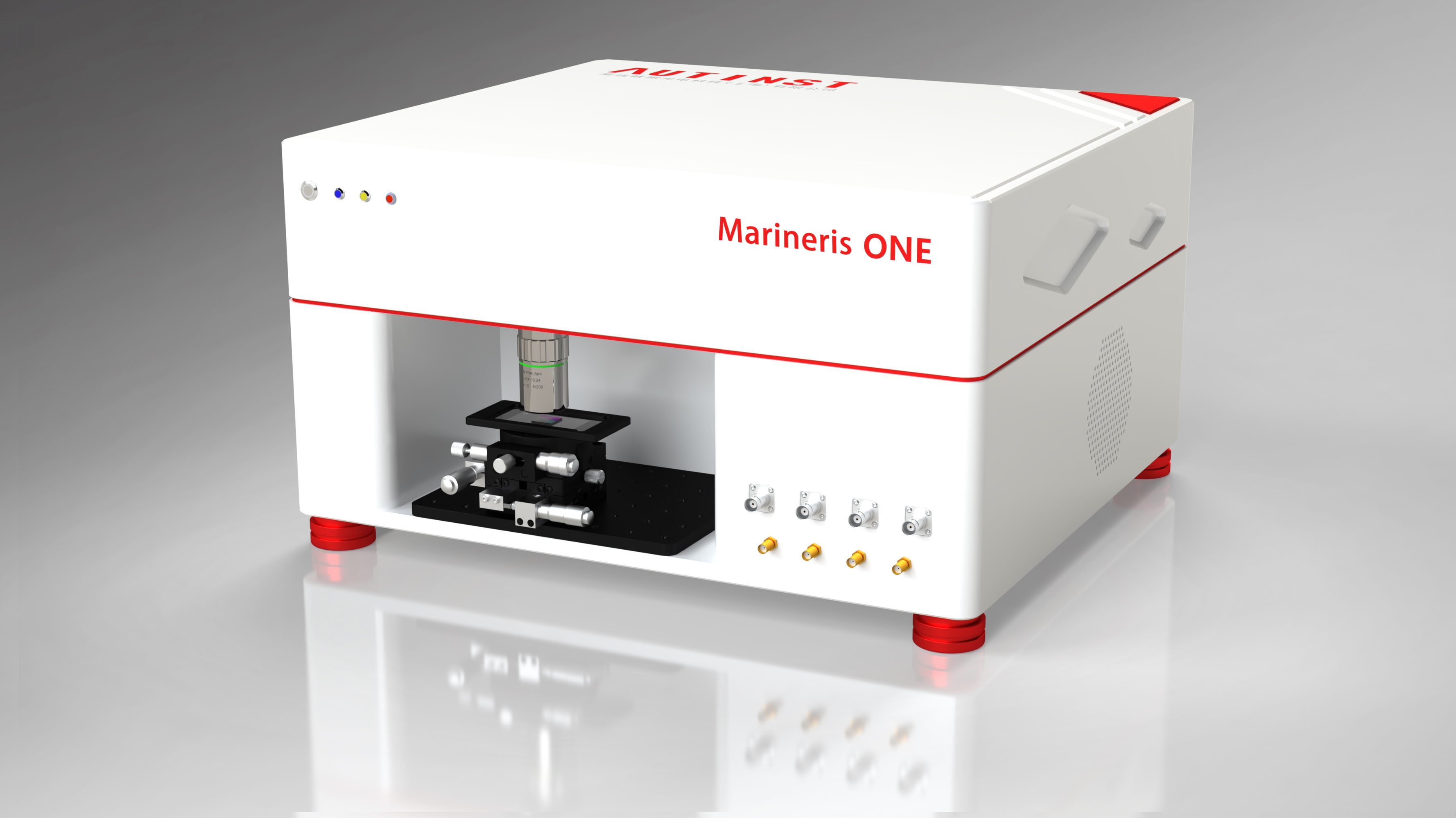 探测激光(波长与泵浦光不同)与泵浦光共线且聚焦于样品表⾯的同一点。由于材料表⾯的反射率会随温度变化(这一效应称为光热反射效应,其比值为光热反射系数),探测光反射回来的光强就携带了样品表⾯的瞬时温度信息。这个微弱的反射信号被光电探测器接收后,由锁相放大器精确测量其相对于泵浦光调制信号的相位延迟。这个相位延迟携带了热波在整个样品内部传播的信息,其随频率变化曲线可以用来是反演样品各层以及层间的热物性模型,并确定相应参数。